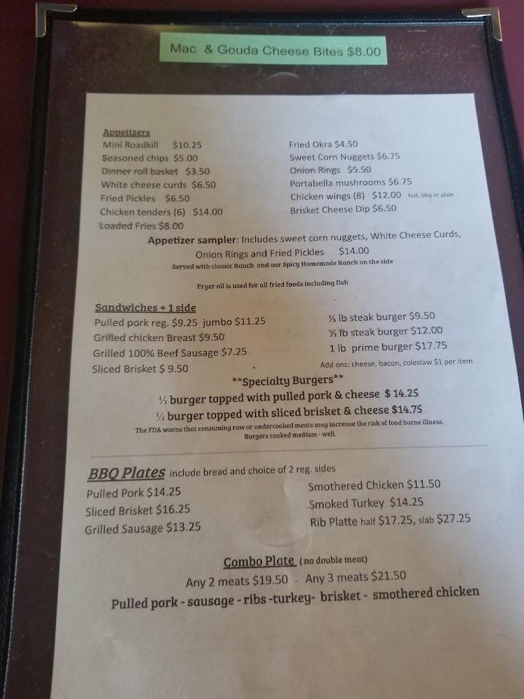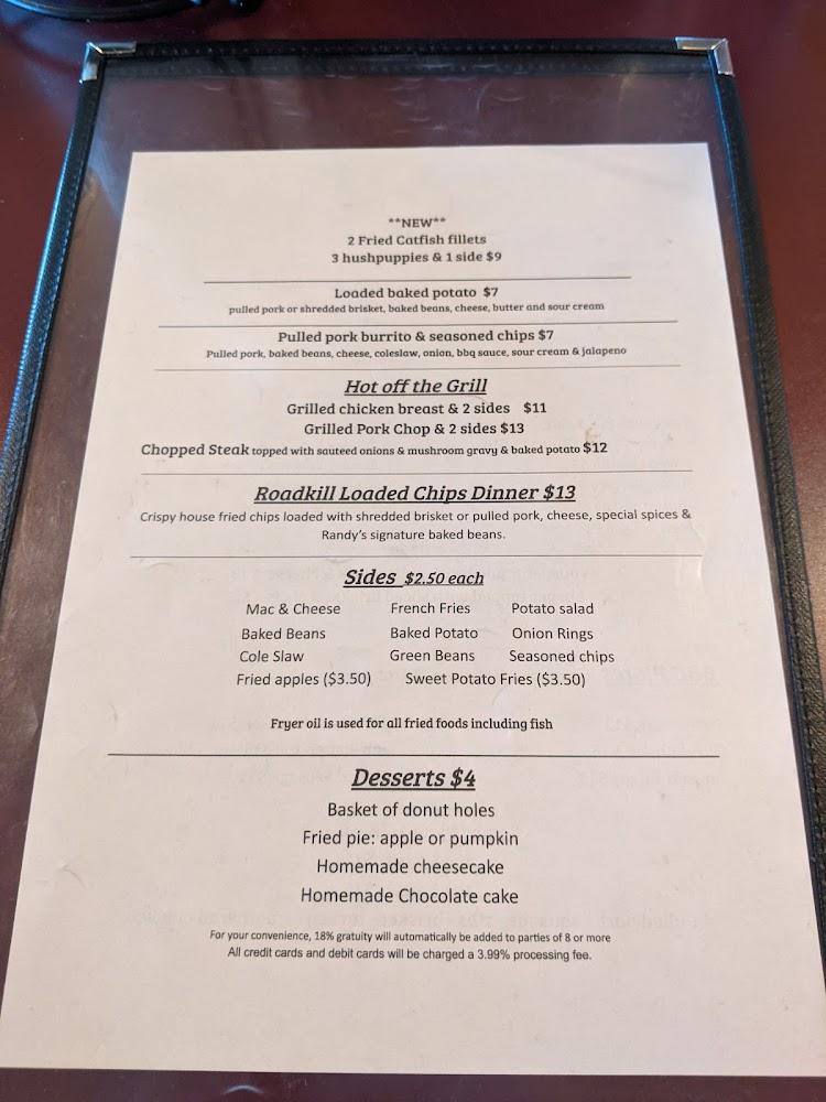 The menu at Randy's Roadkill BBQ & Grill is designed for comfort and flavor. Star dishes include smoked turkey, sausage, and a variety of BBQ sauces. Diners can expect hearty portions of their favorites, from ribs to brisket.